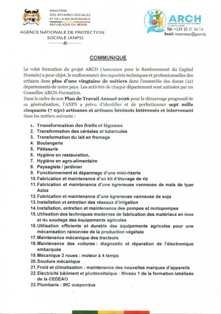 Les centres de formation professionnelle publics et privés du Bénin ont jusqu’au 20 mars 2026 pour postider à l’appel à manifestation d’intérêt lancé par l’Agence Nationale de Protection Sociale (ANPS). Objectif : intégrer le répertoire national 2026 des structures habilitées à dispenser des formations aux artisans dans le cadre du programme ARCH, et contribuer ainsi au renforcement des compétences techniques et à la professionnalisation des métiers sur l’ensemble du territoire.