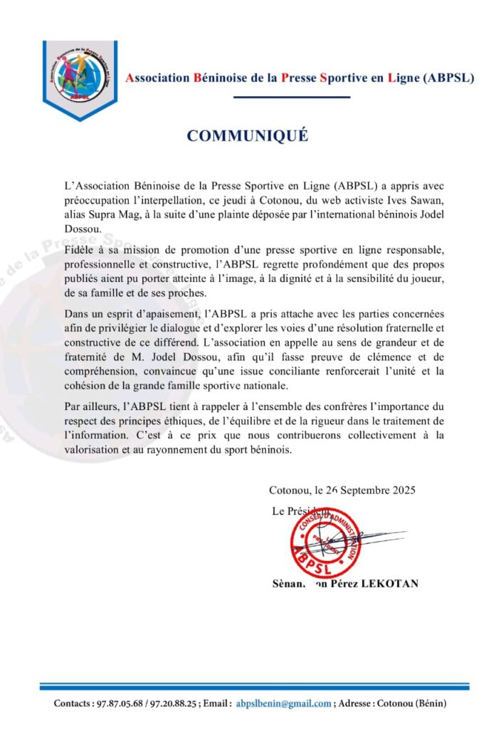 Cette fois, c’est l’Association Béninoise de la Presse Sportive en Ligne (ABPSL) qui a réagi. Dans un communiqué signé par son président Pérez Lekotan, l’organisation exprime sa préoccupation et invite les parties au dialogue afin de préserver la sérénité du climat sportif et médiatique.