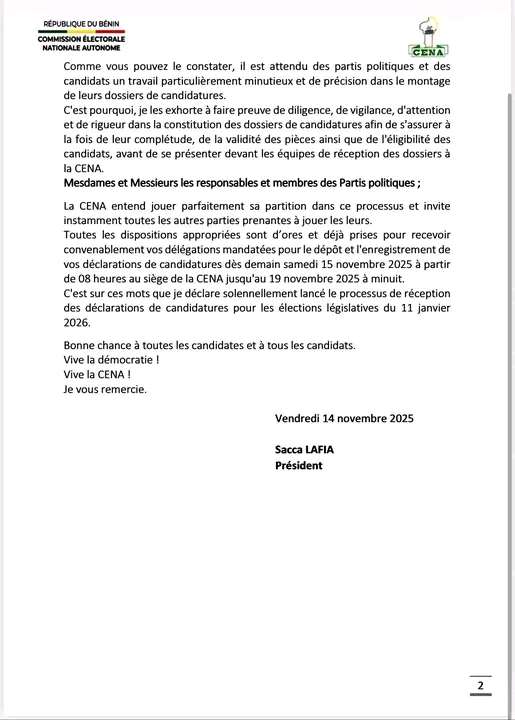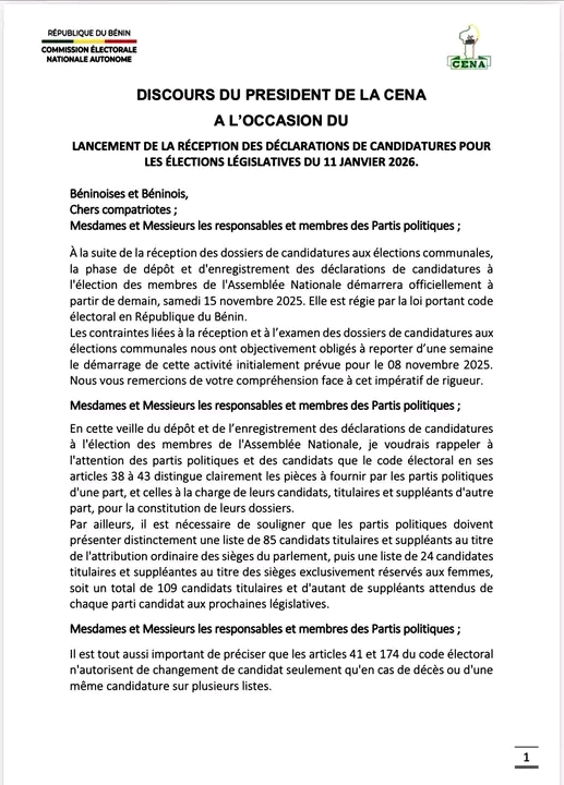 Le Président de la Commission Électorale Nationale Autonome (CENA) a prononcé un discours important à l’occasion du lancement officiel de la réception des déclarations de candidatures pour les élections législatives prévues le 11 janvier 2026 au Bénin. Après la clôture de la phase de réception des dossiers pour les élections communales, la CENA annonce que le dépôt et l’enregistrement des candidatures pour l’élection des membres de l’Assemblée Nationale débuteront officiellement le samedi 15 novembre 2025. Il faut noter que cette date a été décalée d’une semaine par rapport à la date initialement prévue, le 8 novembre 2025, en raison des contraintes liées à l’examen des dossiers communaux.