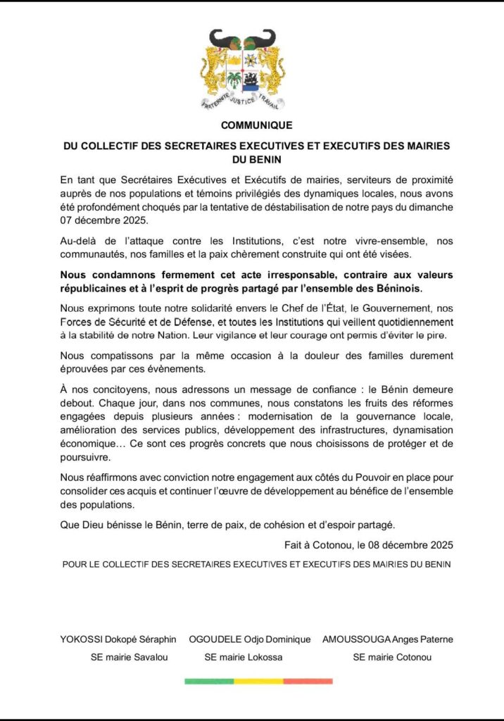 ace à la tentative de déstabilisation survenue le dimanche 7 décembre 2025, les Secrétaires Exécutives et Exécutifs des mairies du Bénin élèvent une voix commune. Profondément choqués par cette attaque contre les institutions et le vivre-ensemble, ils réaffirment leur solidarité envers le Chef de l’État, les Forces de sécurité et l’ensemble des institutions nationales, tout en appelant les populations à préserver les acquis démocratiques et les progrès réalisés dans les communes.