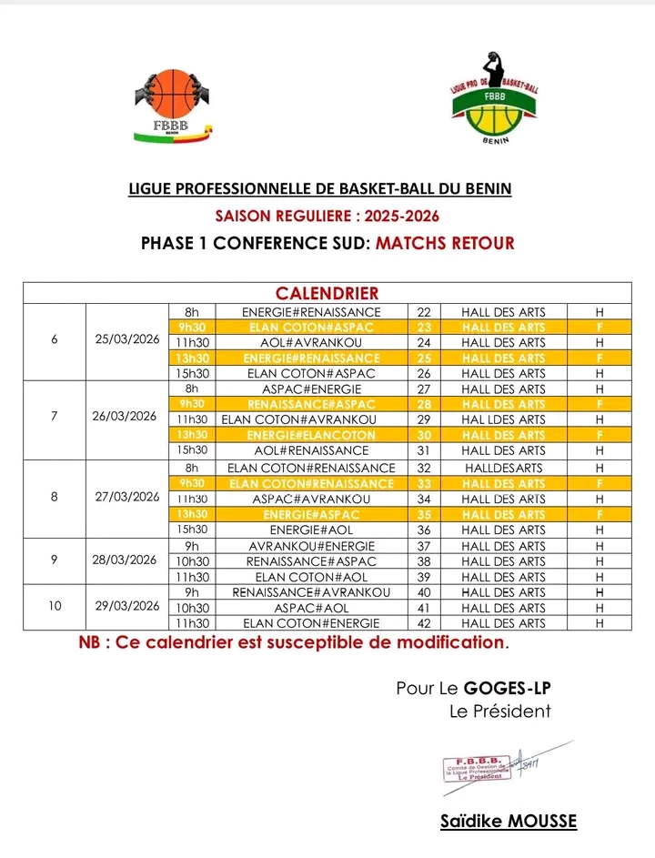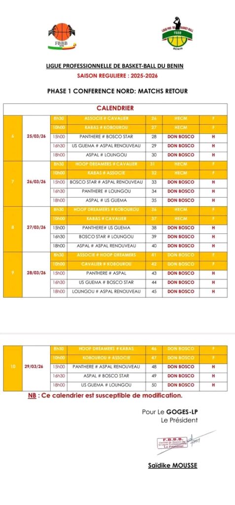 La phase retour de la Ligue Pro de Basketball béninois débutera plus tôt que prévu. Initialement programmée pour le 26 mars, la reprise du championnat est désormais avancée du 25 au 29 mars 2026.