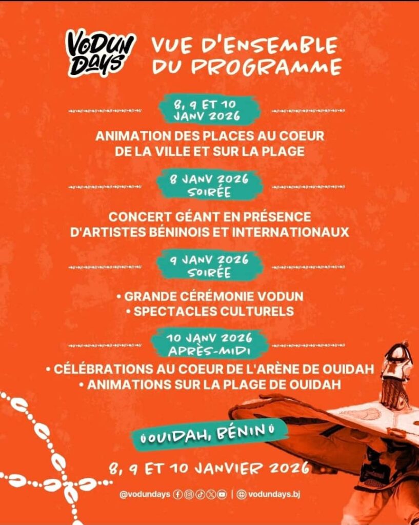 🔸 8 janvier 2026 : La journée débutera par des animations dans les places publiques et sur la plage. La soirée sera quant à elle marquée par un grand concert réunissant des artistes béninois et internationaux.