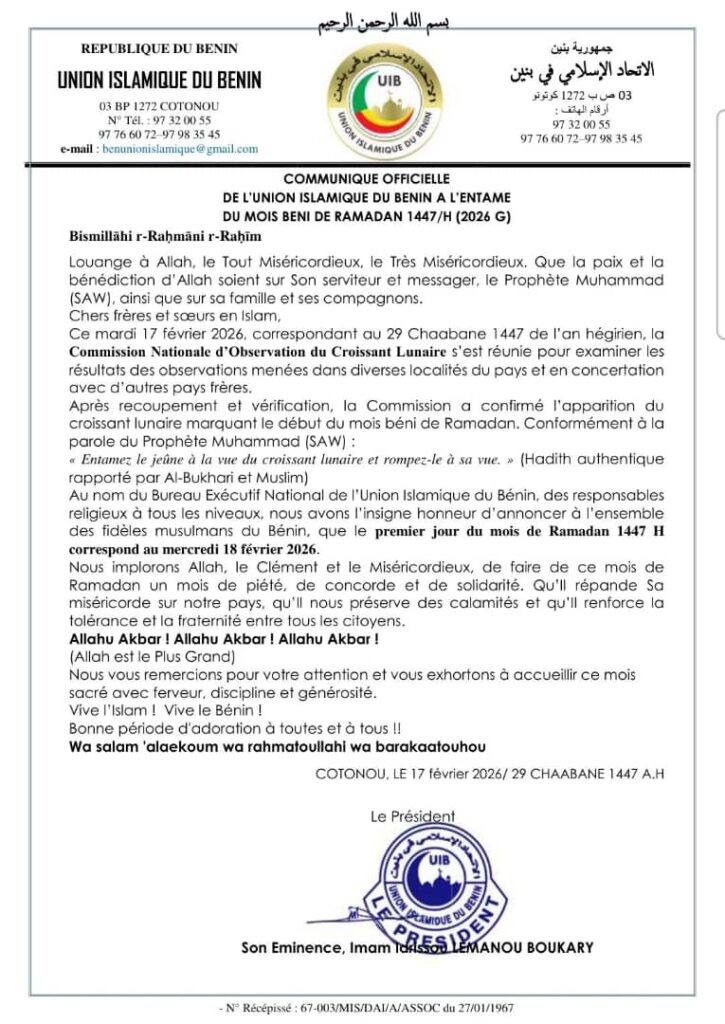Le mois sacré du Ramadan débutera le mercredi 18 février 2026 au Bénin et prendra fin le 19 mars 2026. L’annonce officielle a été faite par le président de l’Union Islamique du Bénin (UIB), l’Imam Idrissou LEMANOU BOUKARY.