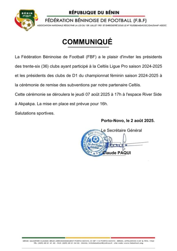 La Fédération Béninoise de Football (FBF) a annoncé l’organisation d’une cérémonie majeure le jeudi 7 août 2025. L’événement, qui se tiendra à l’espace River Side à Akpakpa à partir de 16h, sera l’occasion pour la FBF et son partenaire Celtiis de remettre officiellement les subventions aux clubs pour la saison 2024-2025. Les présidents des 36 clubs ayant participé à la Celtiis Ligue Pro, ainsi que ceux des clubs de D1 du championnat féminin, sont invités à cette cérémonie. Ces subventions représentent un soutien financier essentiel pour les équipes, leur permettant de préparer dans de meilleures conditions la prochaine saison et de continuer à développer le football au Bénin. Ce partenariat entre la FBF et Celtiis, l’opérateur de téléphonie mobile, démontre une fois de plus l’engagement de l’entreprise dans le développement du sport national. La remise de ces subventions est un signal fort envoyé aux acteurs du football béninois, soulignant l’importance de la professionnalisation et du soutien financier dans le monde du sport. Dans un communiqué officiel daté du 2 août 2025, le secrétaire général de la FBF, Claude PAQUI, a signé l’invitation, officialisant ainsi l’événement qui est très attendu par les clubs. Cette initiative s’inscrit dans la volonté de la fédération de garantir une certaine stabilité financière aux clubs et de valoriser les performances des équipes masculines et féminines.