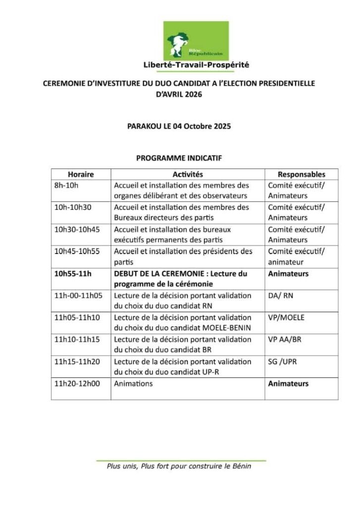 Le Bloc Républicain et ses alliés politiques donnent rendez-vous ce samedi 04 octobre 2025 à Parakou pour la cérémonie d’investiture officielle du duo de candidats à l’élection présidentielle d’avril 2026. Cette rencontre hautement politique marquera la validation et la présentation officielle du ticket présidentiel porté par les grandes forces de la mouvance. Un programme indicatif de cette cérémonie solennelle a été rendu public à cet effet.