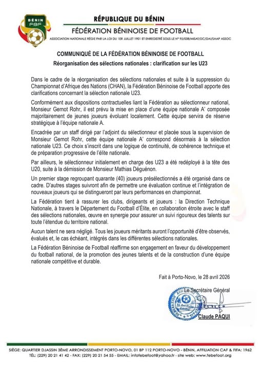 Dans un communiqué publié le 28 avril 2026, la Fédération Béninoise de Football (FBF) apporte des clarifications majeures concernant la réorganisation des sélections nationales, et plus spécifiquement la catégorie des U23. Une refonte qui intervient dans un contexte marqué par la suppression du Championnat d’Afrique des Nations (CHAN).