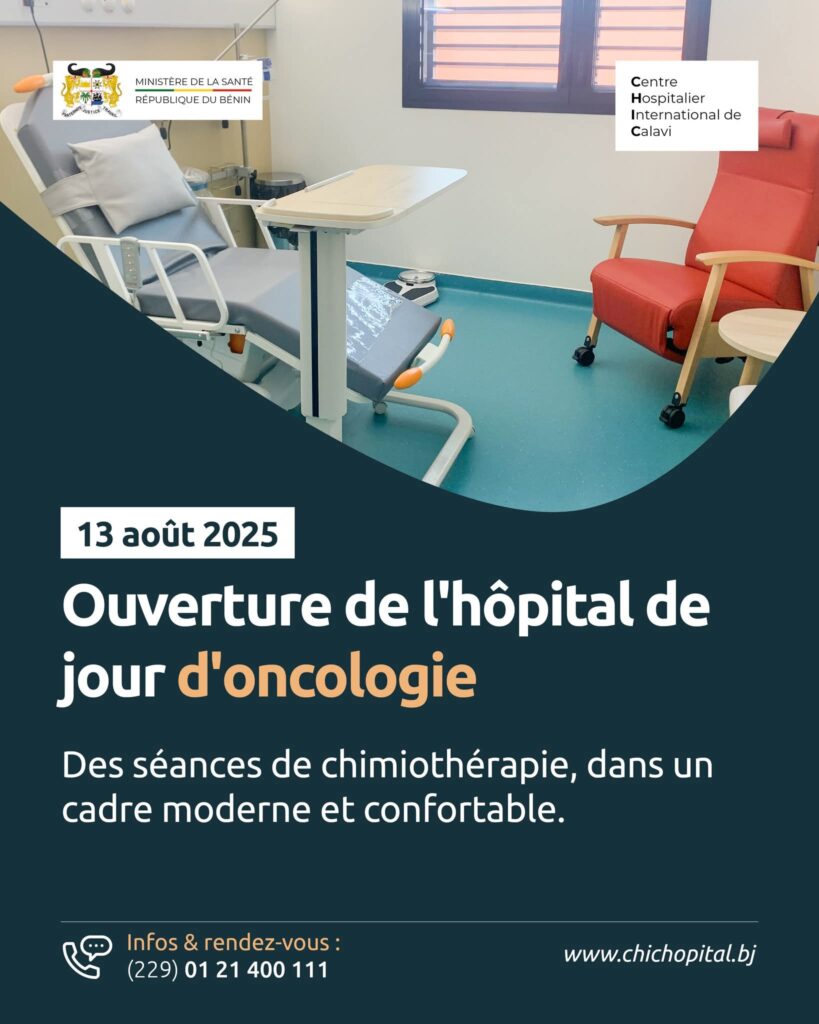 Le Centre Hospitalier International de Calavi (CHIC) franchit une étape majeure dans la mise en œuvre de son plan d’ouverture progressive avec l’inauguration, le 13 août 2025, de son hôpital de jour d’oncologie. Cette nouvelle unité vise à améliorer la prise en charge des patients atteints de cancer en leur offrant des séances de chimiothérapie dans un cadre moderne et confortable.