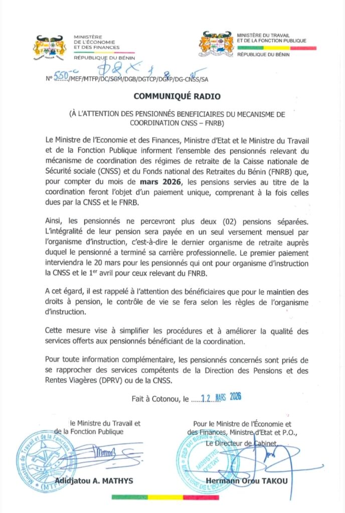Le gouvernement béninois a annoncé une importante réforme concernant le versement des pensions des retraités relevant du mécanisme de coordination entre la Caisse nationale de Sécurité sociale (CNSS) et le Fonds national des Retraites du Bénin (FNRB).