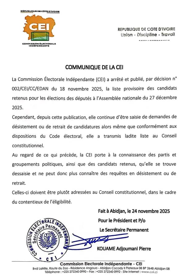 Toutefois, depuis cette publication, la CEI continue de recevoir des demandes de désistement ou de retrait de candidatures. Dans un communiqué rendu public ce 24 novembre 2025 à Abidjan, elle a précisé la nouvelle procédure à suivre : les partis politiques, groupements et candidats doivent désormais adresser ce type de demandes directement au Conseil Constitutionnel. Cette institution est en effet désormais chargée du contentieux de l’éligibilité.