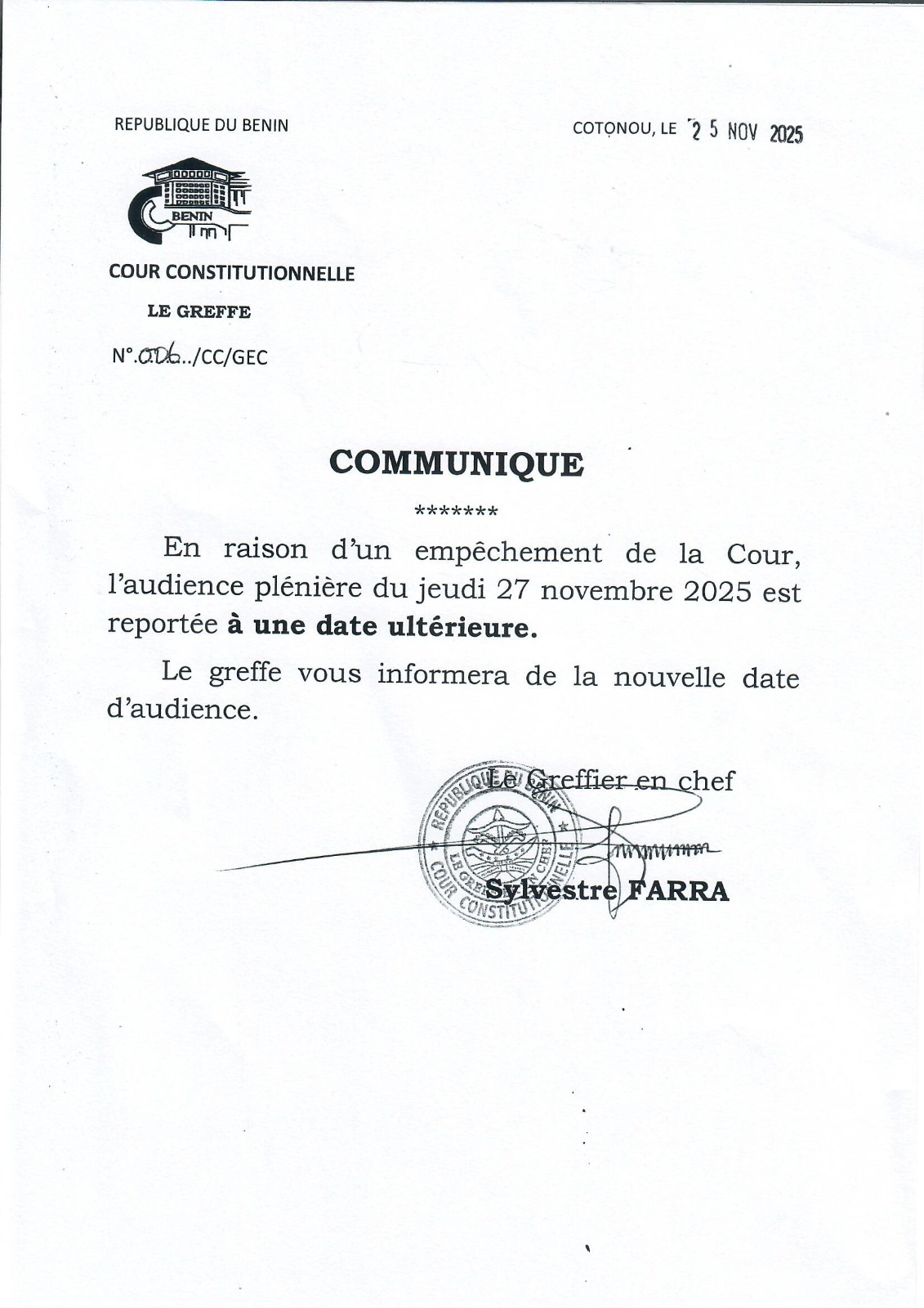 L’audience plénière de la Cour constitutionnelle du Bénin, prévue pour ce jeudi 27 Novembre 2025, n’aura plus lieu. À travers un communiqué en date du 25 novembre 2025, la cour a annoncé son report à une date ultérieure, en raison d’un empêchement.