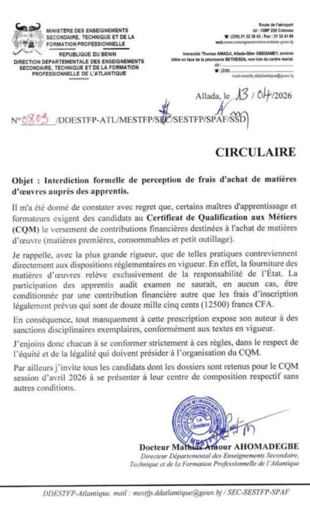 Au Bénin, les autorités éducatives durcissent le ton face aux pratiques abusives dans le cadre du Certificat de qualification aux métiers (CQM). Dans une circulaire datée du 13 avril 2026, la Direction départementale des enseignements secondaire, technique et de la formation professionnelle de l’Atlantique a formellement interdit toute perception de frais supplémentaires auprès des candidats. Le document rappelle que les maîtres d’apprentissage et les formateurs ne sont pas autorisés à exiger des contributions financières pour l’achat de matières d’œuvre. Seuls les frais d’inscription officiellement fixés à 12 500 francs CFA sont reconnus par les textes en vigueur.