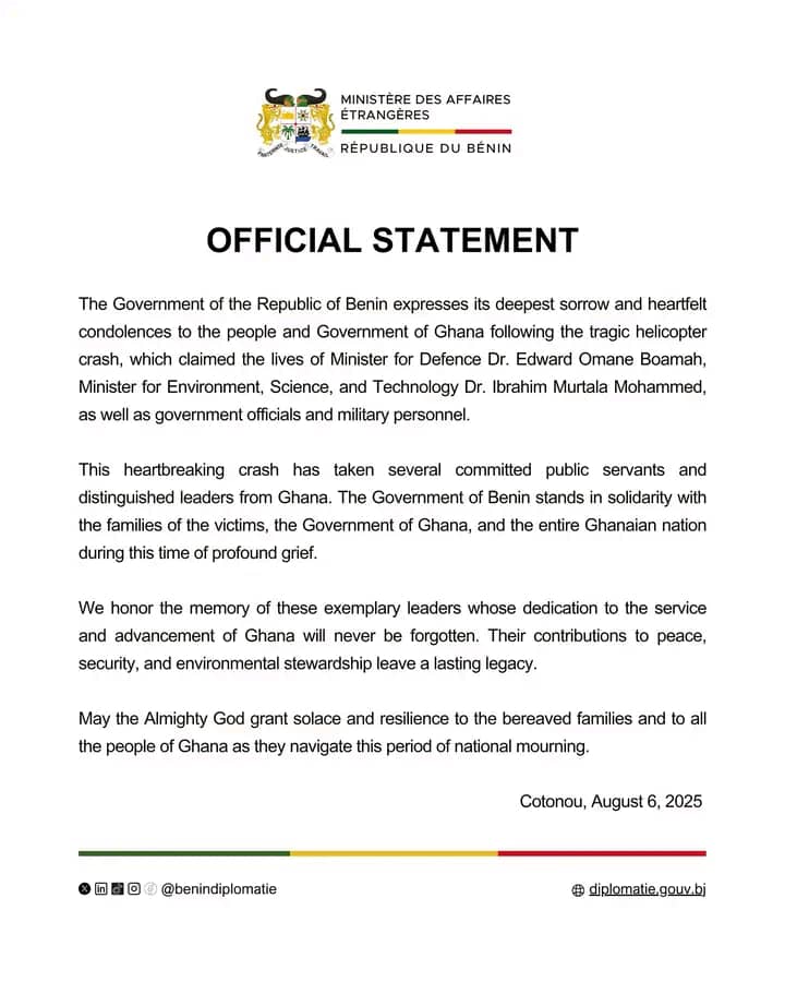 Dans son message, le Ministère des Affaires étrangères du Bénin a salué la mémoire de ces « serviteurs publics engagés » et « leaders distingués », dont les contributions à la paix, à la sécurité et à la protection de l’environnement « laisseront un héritage durable ». Le communiqué souligne également la solidarité du Bénin avec les familles endeuillées et l’ensemble de la nation ghanéenne, confrontée à une « douleur profonde ».