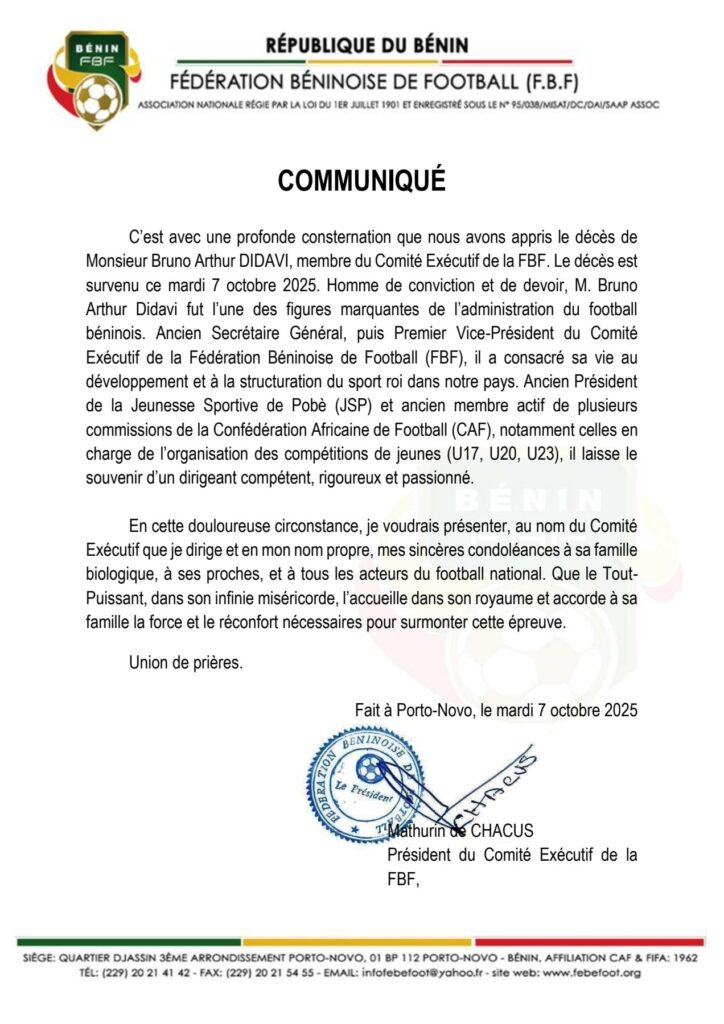 Le monde du football béninois est en deuil. Bruno Arthur Didavi, ancien secrétaire général et vice-président de la Fédération béninoise de football (FBF), est décédé ce mardi 7 octobre 2025.