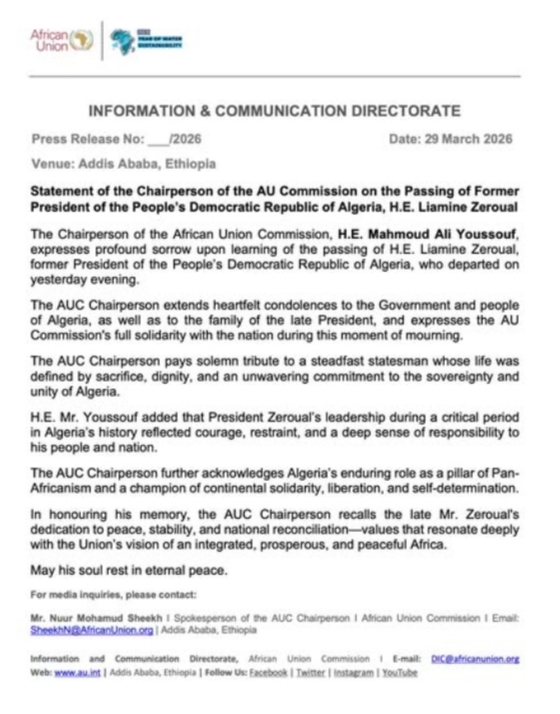 Dans un communiqué publié ce dimanche 29 mars 2026, le président de la Commission de l’UA, Mahmoud Ali Youssouf, a exprimé sa « profonde tristesse » et adressé ses plus sincères condoléances aux autorités algériennes, au peuple, ainsi qu’à la famille du défunt. Il a également réaffirmé la solidarité indéfectible de l’organisation continentale en cette période de deuil national.