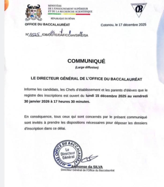 Le Directeur général de l’Office du Baccalauréat, Alphonse da Silva, a souligné l’importance pour tous les candidats concernés de respecter ce délai impératif en déposant leur dossier complet dans les temps.