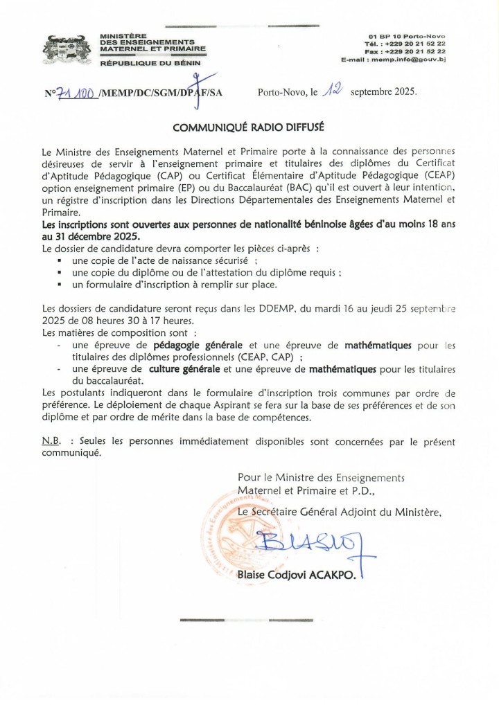 Le Ministère des Enseignements Maternel et Primaire (MEMP) lance un appel à candidatures pour le recrutement de nouveaux instituteurs. Les personnes titulaires d’un CAP, d’un CEAP option Enseignement Primaire ou simplement du Baccalauréat sont invitées à s’inscrire du 16 au 25 septembre 2025 dans les directions départementales. Les candidats, qui doivent être de nationalité béninoise et avoir au moins 18 ans, seront soumis à une sélection par ordre de mérite et déployés dans les communes selon leurs préférences.