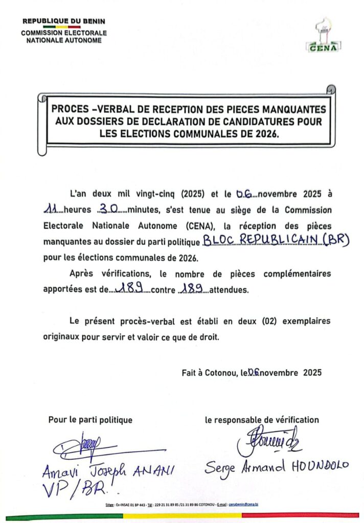 Le Bloc Républicain (BR) a franchi avec succès, ce jeudi, une étape décisive du processus électoral en vue des communales de 2026. La Commission Électorale Nationale Autonome (CENA) a en effet officiellement remis au parti le procès-verbal attestant de la réception et de la conformité des pièces manquantes à son dossier de candidature.
