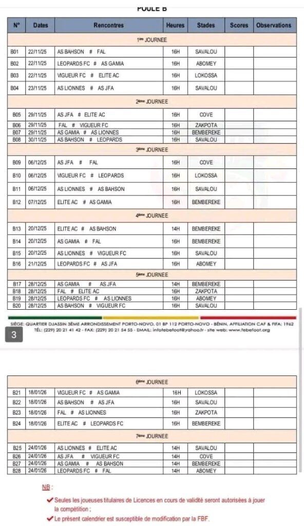 C’est officiel ! Le championnat national féminin de première division reprendra le 22 novembre 2025. La Fédération béninoise de football (FBF) a publié le calendrier complet de la saison, marquant ainsi le retour de la compétition au sommet du football féminin béninois.