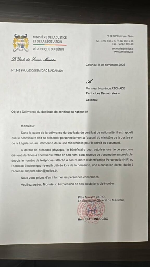 Dans un courrier portant la référence N° 2453/MJL/DC/SGM/DACS/ADAN/SA, le ministère de la Justice indiquait à Monsieur Nourénou Atchadé des Démocrates que le retrait des duplicatas de certificats de nationalité devait se faire « personnellement » par le bénéficiaire ou, à défaut, par « une tierce personne dûment identifiée » préalablement autorisée via l’adresse email ou le numéro de téléphone attaché au Numéro d’Identification Personnelle (NIP) du demandeur.