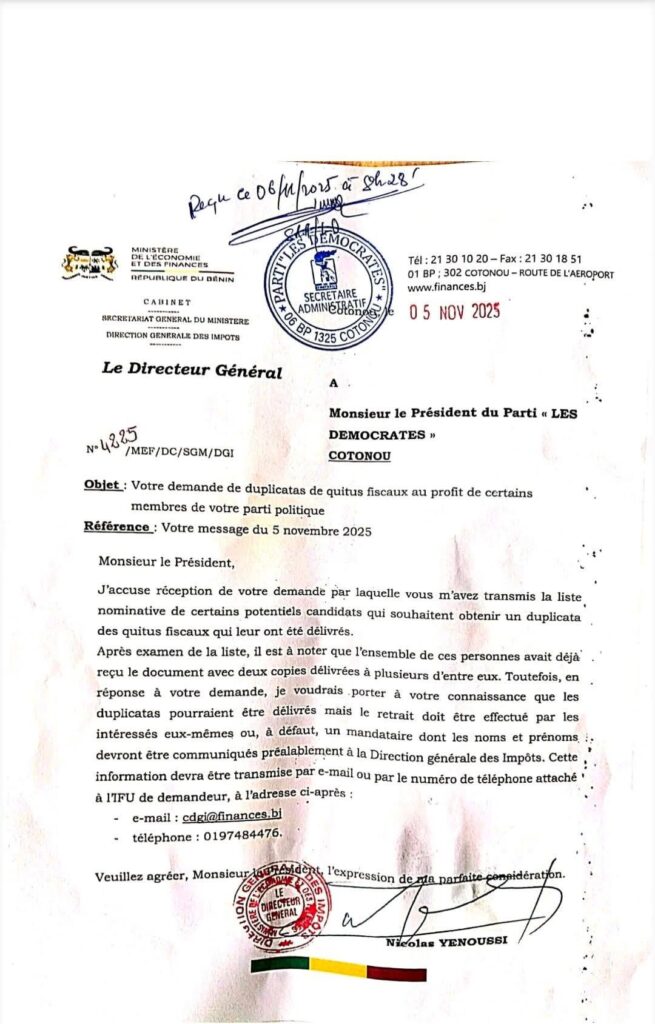 De son côté, la DGI, par le courrier N° 435/MEF/DC/SGM/DGI, rappelait que les duplicatas de quitus fiscaux ne pouvaient être retirés que « par les intéressés eux-mêmes ou, à défaut, un mandataire dont les noms et prénoms devront être communiqués préalablement » via l’adresse edg@finances.bj ou le numéro de téléphone attaché à l’Identifiant Fiscal Unique (IFU).