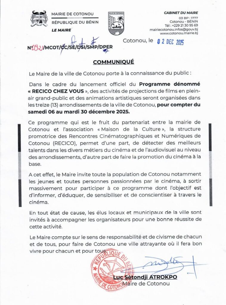 La culture s’invite au cœur des quartiers. Le maire de Cotonou, Luc Sétondji Atrokpo, a officiellement annoncé le lancement du programme « RECICO Chez Vous », une vaste opération de projections de films en plein air et d’animations artistiques qui sillonnera les 13 arrondissements de la capitale économique, du samedi 6 au mardi 30 décembre 2025.