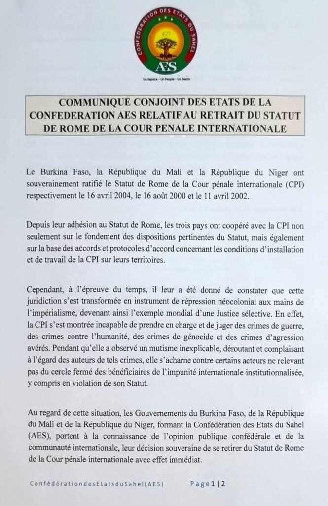 Dans un communiqué conjoint rendu public ce lundi, les trois pays membres de la Confédération des États du Sahel (AES) – le Burkina Faso, le Mali et le Niger – ont annoncé leur retrait immédiat du Statut de Rome, fondement de la Cour pénale internationale (CPI). Une décision souveraine justifiée par des accusations sévères de « justice sélective » et de complicité avec « l’impérialisme ».