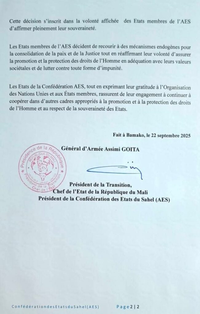 Le communiqué, signé par le Général d’Armée Assimi Goïta, Président de la Transition du Mali et Président en exercice de l’AES, assure que la coopération se poursuivra dans « d’autres cadres appropriés » pour la protection des droits humains, tout en exigeant le « respect de la souveraineté des États ».