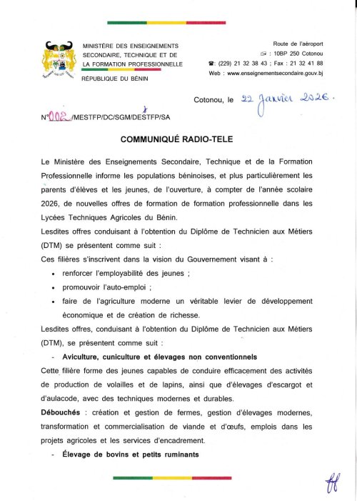 Le gouvernement béninois élargit l’offre de formation professionnelle dans les lycées techniques agricoles à compter de l’année scolaire 2026. L’annonce a été faite à travers un communiqué radio-télé diffusé le 22 janvier par le Ministère des Enseignements Secondaire, Technique et de la Formation Professionnelle (MESTFP).