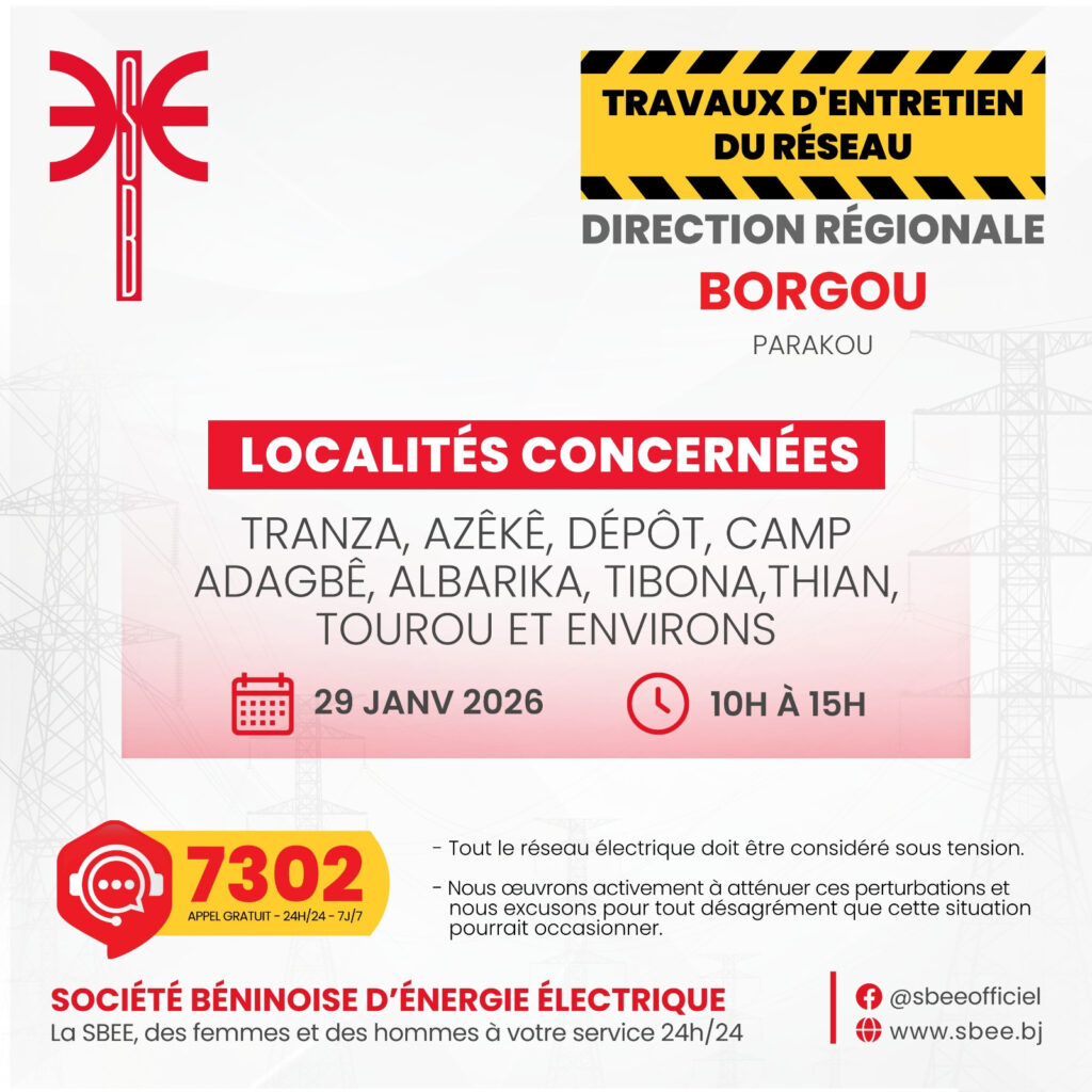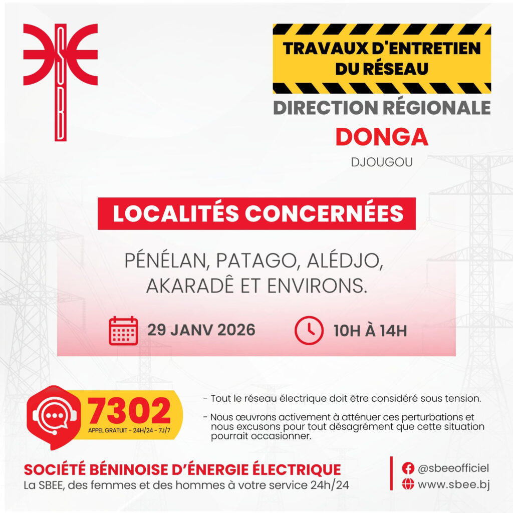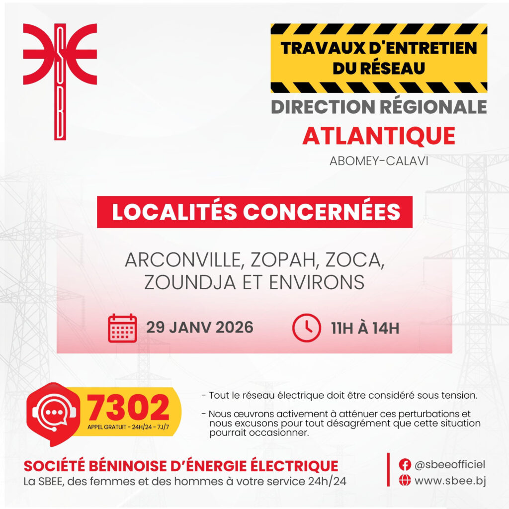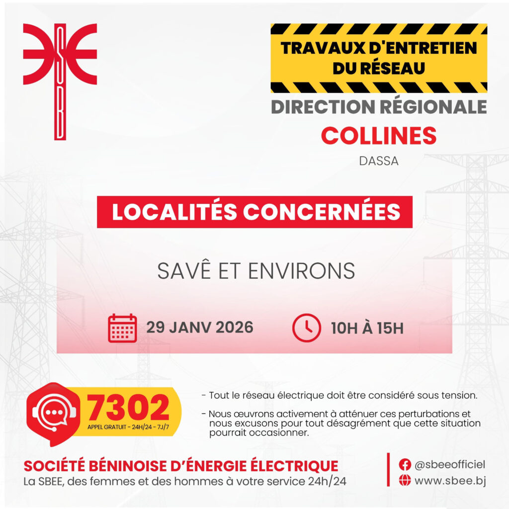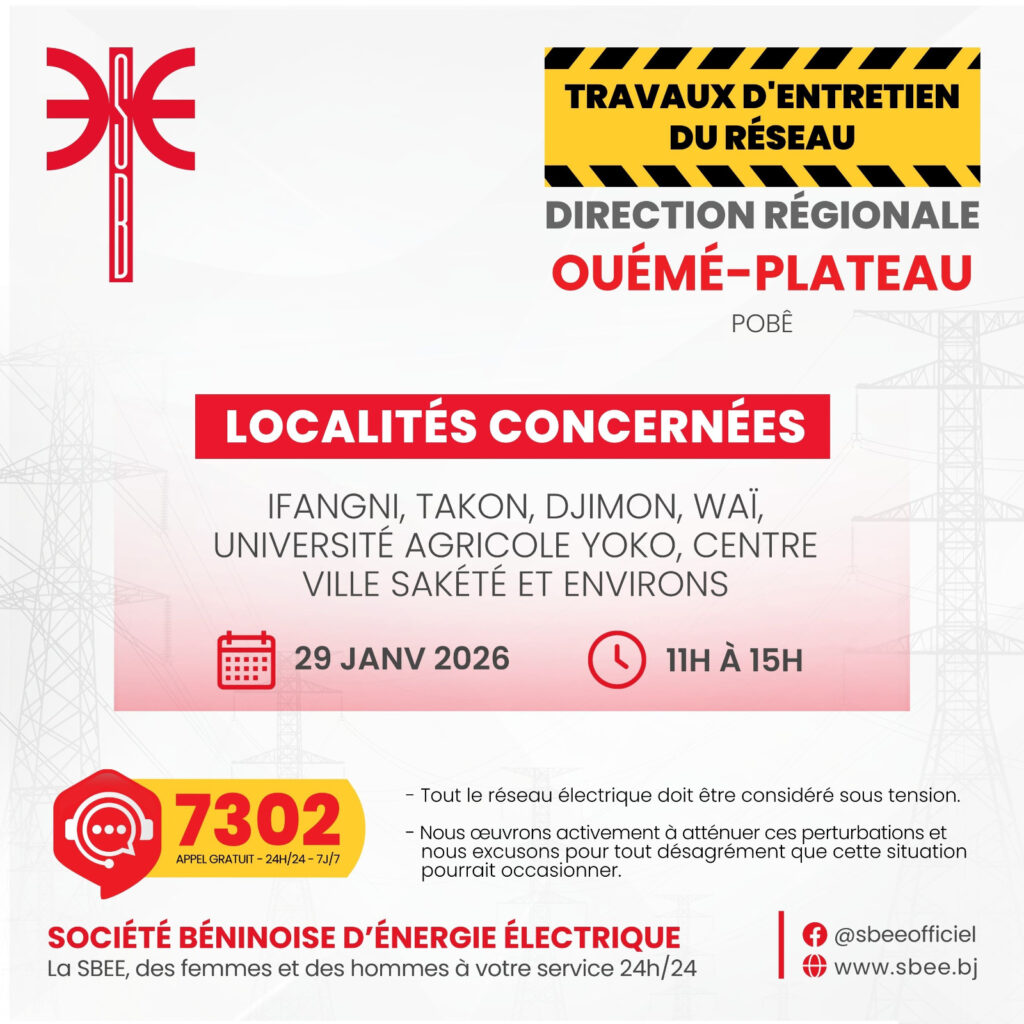 Dans le cadre de l’amélioration continue de son réseau, la Société Béninoise d’Énergie Électrique (SBEE) et ses partenaires effectueront des travaux de maintenance ce jeudi 29 janvier 2026.