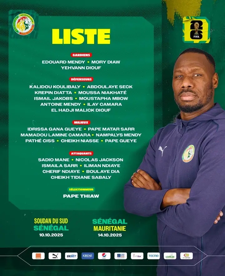 En défense, les piliers Kalidou Koulibaly, Moussa Niakhaté, Abdoulaye Seck et Krépin Diatta restent incontournables, tandis que la hiérarchie des gardiens demeure inchangée avec Édouard Mendy, Mory Diaw et Yehvann Diouf. En attaque, le capitaine Sadio Mané mènera l’offensive aux côtés de Boulaye Dia, Nicolas Jackson, Iliman Ndiaye, Chérif Ndiaye, Cheikh Tidiane Sabaly et du revenant Ismaïla Sarr.