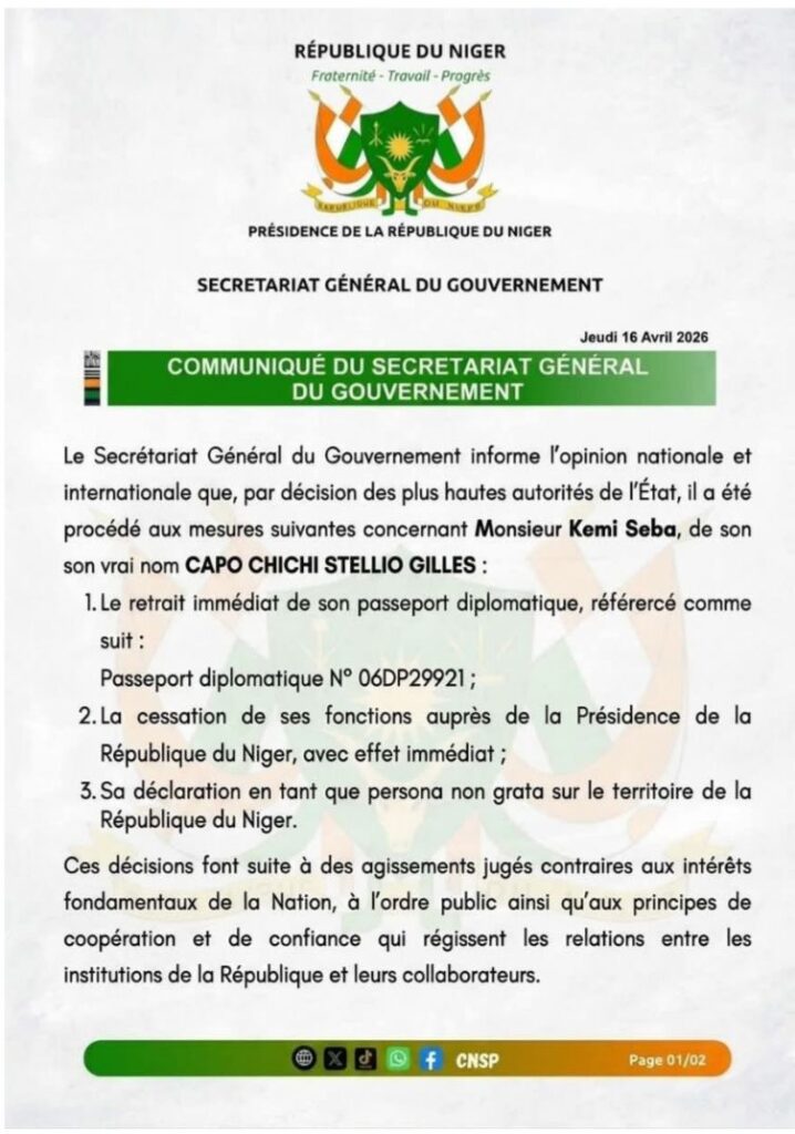 Ces décisions, prises par les plus hautes autorités de l’État au Niger portent notamment sur le retrait immédiat de son passeport diplomatique numéro 06DP29921, la cessation de ses fonctions au sein de la Présidence, ainsi que sa déclaration en tant que persona non grata sur le territoire nigérien.
