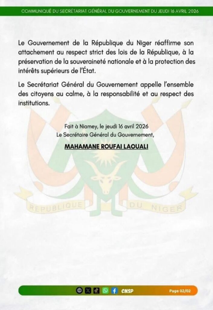 Le gouvernement réaffirme, dans son communiqué, son attachement au respect des lois de la République, à la souveraineté nationale et à la protection des intérêts supérieurs de l’État. Il appelle également la population au calme, à la responsabilité et au respect des institutions.