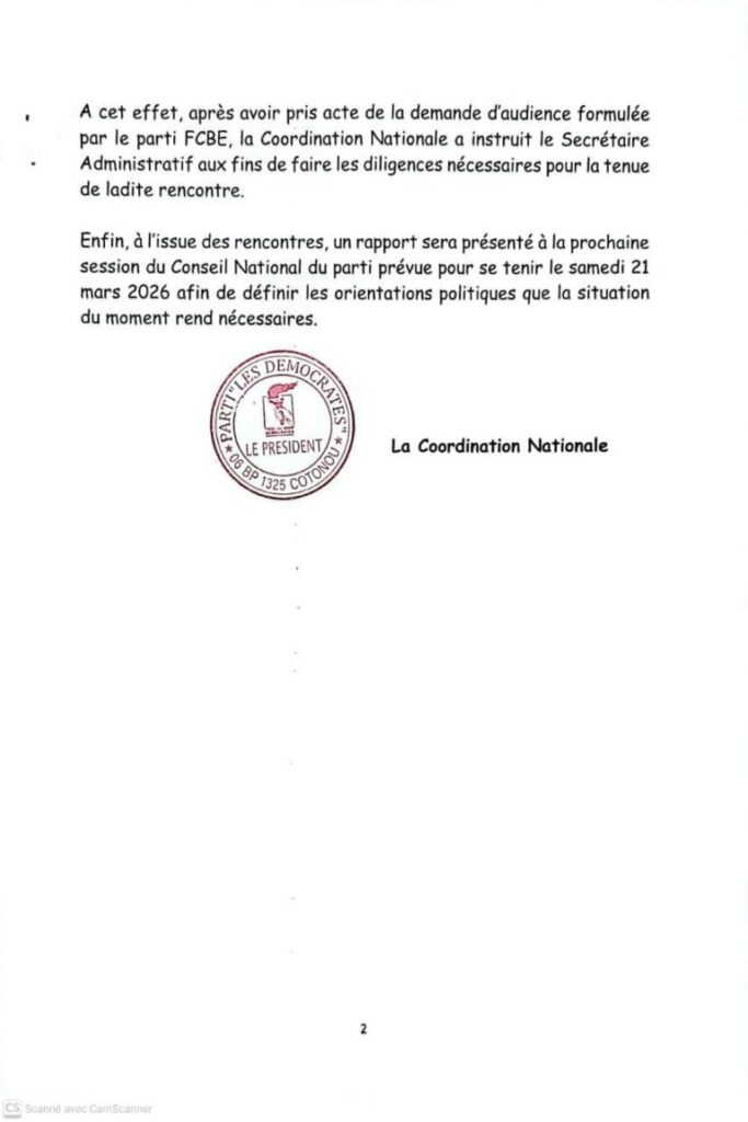 La Coordination Nationale a donné son accord de principe pour rencontrer les candidats qui en feront la demande. Plus concrètement, une première démarche officielle a été initiée : la Coordination a pris acte d’une demande d’audience formulée par le parti FCBE (Forces Cauris pour un Bénin Émergent). Le Secrétaire Administratif a été instruit pour organiser cette rencontre, signe d’un rapprochement potentiel entre les deux formations.