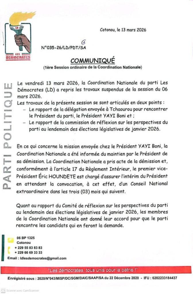 La Coordination Nationale du parti Les Démocrates était en conclave ce vendredi 13 mars 2026 pour sa première session ordinaire. Au cœur des débats : le sort de la présidence du parti et les perspectives d’alliances après les élections législatives de janvier. Issue de cette réunion, une décision majeure : la démission de Boni YAYI, président du parti, est officiellement actée.