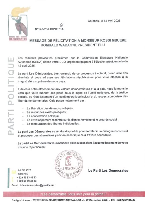 Alors que les résultats provisoires de l’élection présidentielle du 12 avril 2026 viennent d’être proclamés par la Commission Électorale Nationale Autonome (CENA), le parti Les Démocrates, bien que n’ayant pas pris part au processus électoral, a choisi la voie républicaine. Dans un message officiel adressé au président élu, Kossi Mbueke Romuald Wadagni, la formation politique prend acte des résultats et lui adresse ses félicitations.
