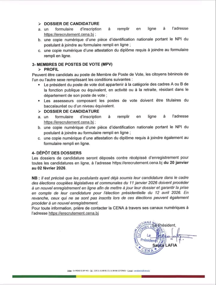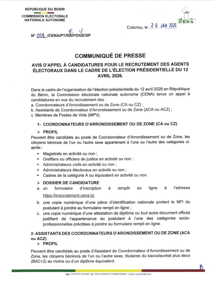 Ce mardi 20 janvier 2026, la Commission électorale nationale autonome (CENA) a lancé, le processus de recrutement des agents électoraux en vue de l’élection présidentielle prévue le 12 avril prochain au Bénin.