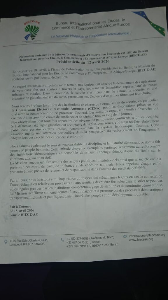 Ce 18 avril, la Mission Internationale d’Observation Électorale (MIOE) du Bureau International pour les Études, le Commerce et l’Entrepreneuriat Afrique-Europe (BIECE-AE) a rendu public son rapport préliminaire sur le déroulement du scrutin présidentiel du 12 avril au Bénin. Si la mission se félicite globalement des conditions de vote, elle relève des disparités préoccupantes dans la mobilisation des électeurs, notamment à Cotonou.