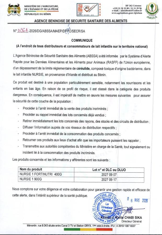 L’Agence Béninoise de Sécurité Sanitaire des Aliments (ABSSA) a ordonné le retrait immédiat de plusieurs lots de lait infantile de marque NURSIE, après la détection d’un dépassement de la limite réglementaire de céréulide, une toxine dangereuse pour les nourrissons.