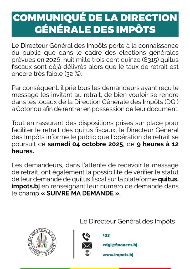 Face à cette situation, le Directeur Général des Impôts a décidé de prendre des mesures exceptionnelles pour faciliter l’opération. Il a ainsi annoncé que les services de la DGI resteront ouverts ce samedi 4 octobre 2025, de 9h à 12h, spécifiquement pour permettre aux demandeurs de récupérer leur précieux sésame.