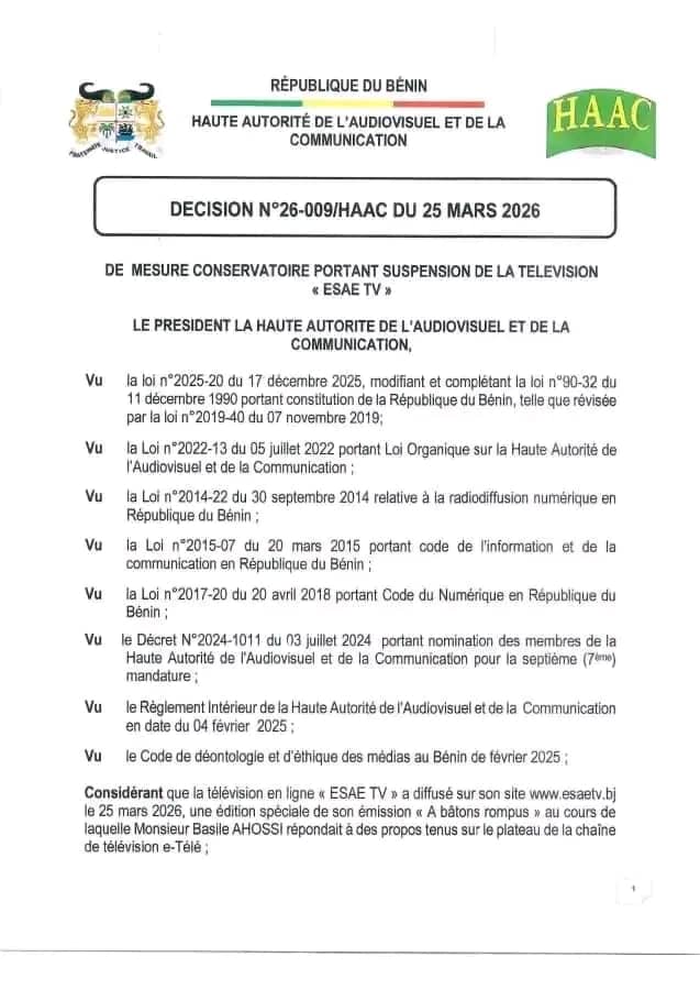Au Bénin, la Haute Autorité de l’Audiovisuel et de la Communication (HAAC) a décidé de suspendre, jusqu’à nouvel ordre, les activités de la web télévision « ESAE TV ». Et pour cause, cette mesure conservatoire fait suite à des faits jugés graves par l’institution de régulation des médias.