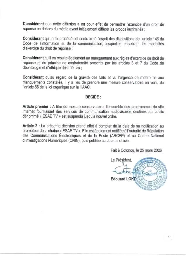 C’est à travers la décision n°26-009/HAAC en date du 25 mars 2026, que l’ensemble des programmes diffusés par cette plateforme audiovisuelle en ligne est concerné. A cet effet, ESAE TV est sommée de cesser immédiatement toute diffusion de contenus destinés au public, en attendant les conclusions définitives de la procédure engagée.