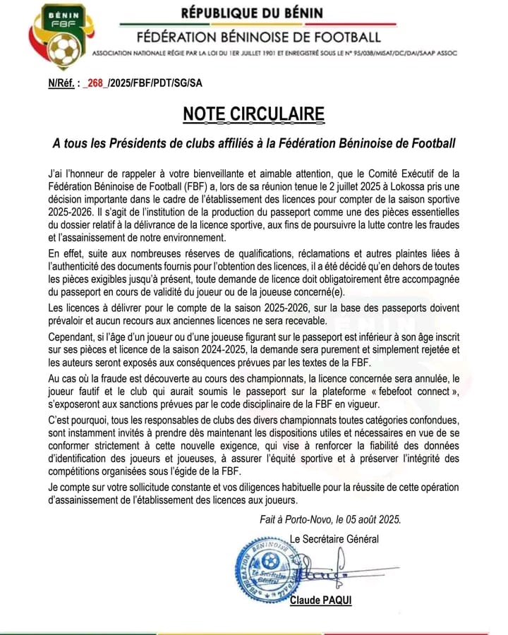 La Fédération Béninoise de Football (FBF) annonce un changement majeur pour la prochaine saison sportive. Dans une note circulaire adressée à tous les présidents de clubs affiliés, le Secrétaire Général de la FBF, Claude Paqui, a rappelé la décision prise le 2 juillet 2025 de rendre obligatoire la production d’un passeport en cours de validité pour toute demande de licence.
