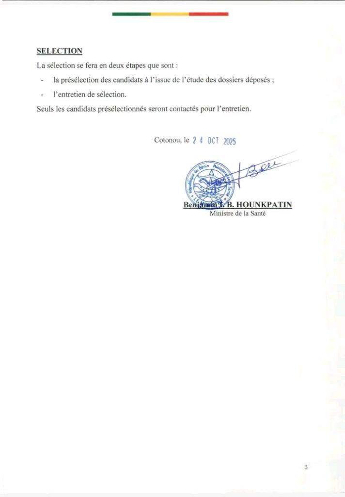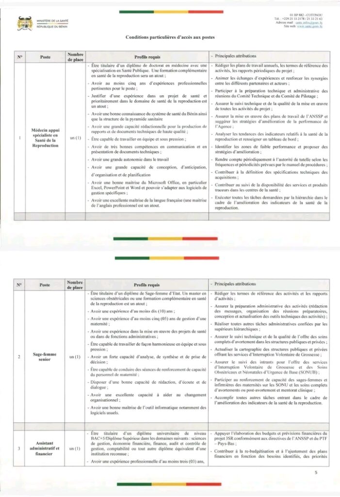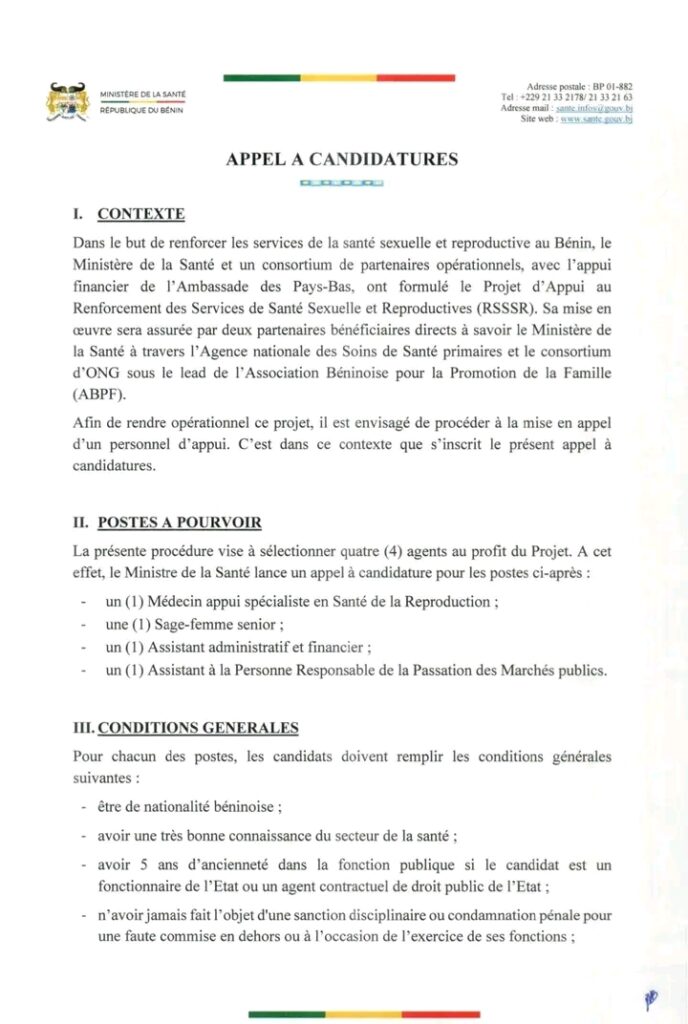 Au Bénin, le Ministère de la Santé a lancé un appel à candidatures pour le recrutement de quatre agents dans le cadre du Projet d’Appui au Renforcement des Services de Santé Sexuelle et Reproductive (RSSSR).