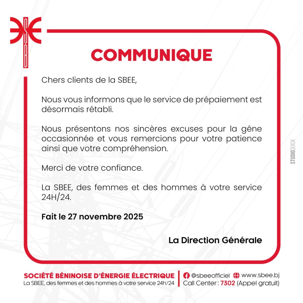 Après une période d’indisponibilité ayant affecté ses clients, la Société Béninoise d’Énergie Électrique (SBEE) annonce officiellement le retour à la normale du service de prépaiement. Dans un communiqué rendu public ce jeudi 27 novembre 2025, la direction générale présente ses excuses et remercie les usagers pour leur patience.