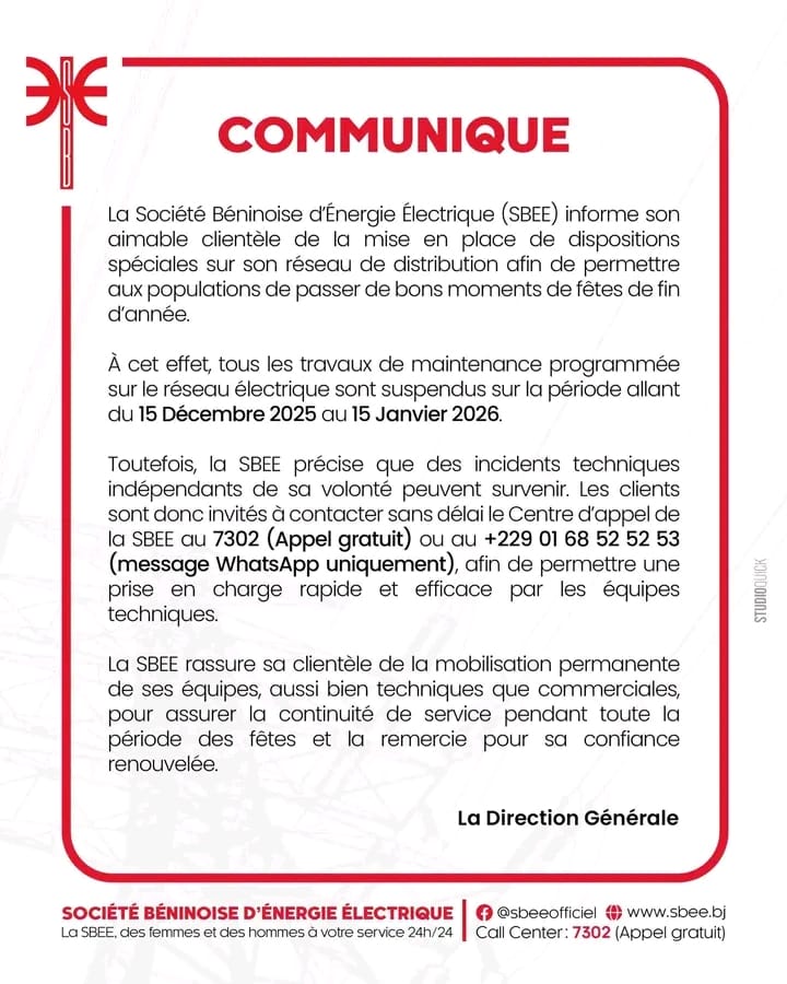 La Société Béninoise d’Énergie Électrique (SBEE) a informé sa clientèle de la mise en place de dispositions particulières sur son réseau de distribution afin de garantir un service optimal pendant la période des fêtes de fin d’année. Dans un communiqué officiel, la SBEE annonce la suspension de tous les travaux de maintenance programmée sur le réseau électrique du 15 décembre 2025 au 15 janvier 2026. Cette mesure vise à éviter toute interruption planifiée du courant et permettre aux populations de profiter pleinement des festivités. Cependant, la société précise que des incidents techniques indépendants de sa volonté peuvent survenir. Pour cela, la SBEE invite ses clients à contacter sans délai son Centre d’appel au numéro gratuit 7302 ou via WhatsApp au +229 01 68 52 52 53 pour signaler tout problème technique. Ces dispositifs visent à assurer une prise en charge rapide et efficace par les équipes techniques.
