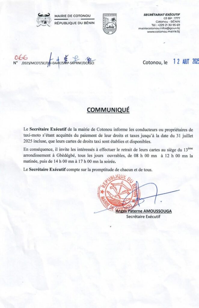 Dans un effort d’assainissement du secteur des transports, la mairie de Cotonou a publié un communiqué important via son Secrétariat Exécutif. Le document informe l’ensemble des conducteurs et propriétaires de taxi-motos de la ville de l’opération de retrait des cartes de droits taxi. Cette initiative vise à régulariser la situation des professionnels et à mieux organiser le transport urbain, marquant ainsi une étape décisive dans la modernisation de la capitale économique béninoise.