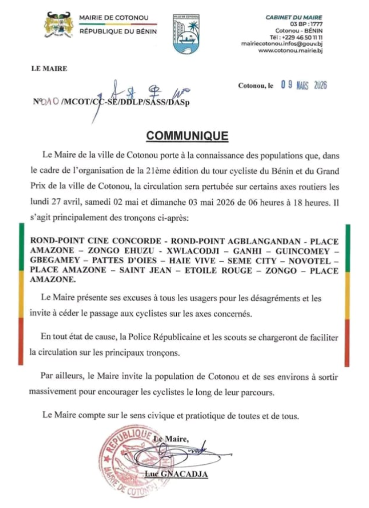 La Mairie de Cotonou informe la population que la circulation dans la ville connaîtra d’importantes perturbations à l’occasion de la 21ème édition du Tour Cycliste du Bénin et du Grand Prix de la ville de Cotonou. Ces événements sportifs majeurs se tiendront les lundi 27 avril, samedi 2 mai et dimanche 3 mai 2026, de 6 heures à 18 heures. Les tronçons routiers concernés par ces restrictions incluent plusieurs axes stratégiques de la capitale économique du Bénin, notamment : le rond-point Ciné Concorde, le rond-point Agblangandan, la Place Amazone, Zongo Ehuzu, Xwlacodji, Ganhi, Guincomey, Gbegamey, Pattes d’oies, Haie Vive, Sème City, Novotel, Saint Jean, Étoile Rouge, et plusieurs autres lieux emblématiques.