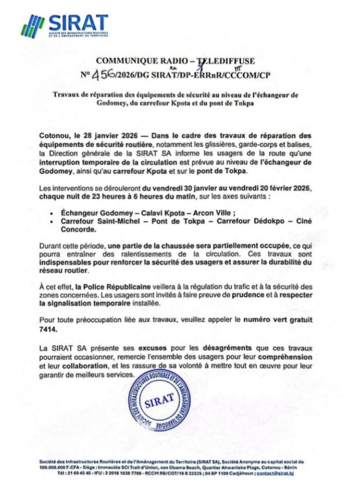La SIRAT SA a publié un communiqué officiel annonçant des travaux de réparation des équipements de sécurité routière à plusieurs endroits stratégiques de Cotonou : l’échangeur de Godomey, le carrefour Kpota et le pont de Tokpa. Ces interventions visent principalement à entretenir les glissières, garde-corps et balises, des éléments essentiels pour renforcer la sécurité et la durabilité du réseau routier.