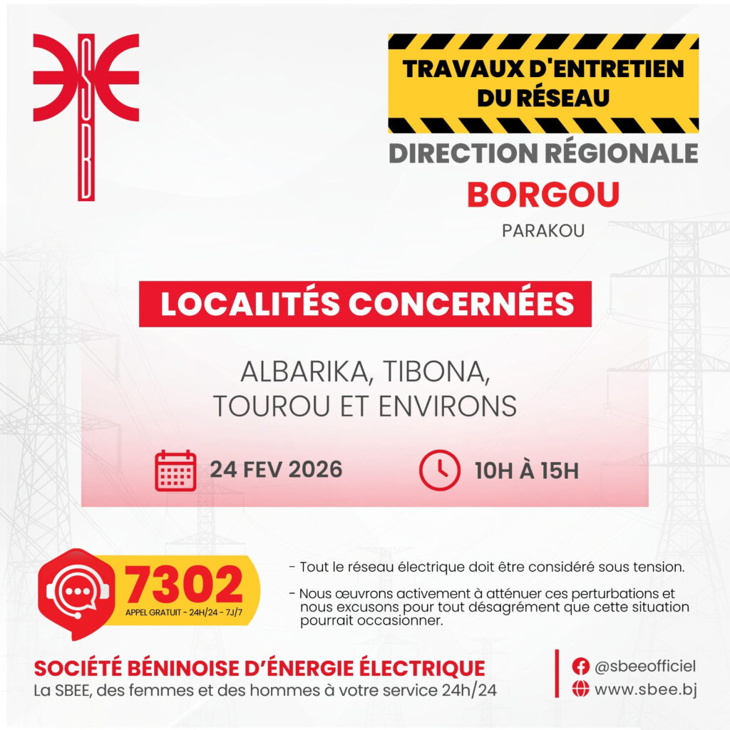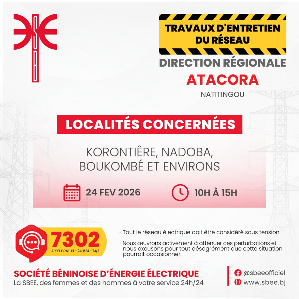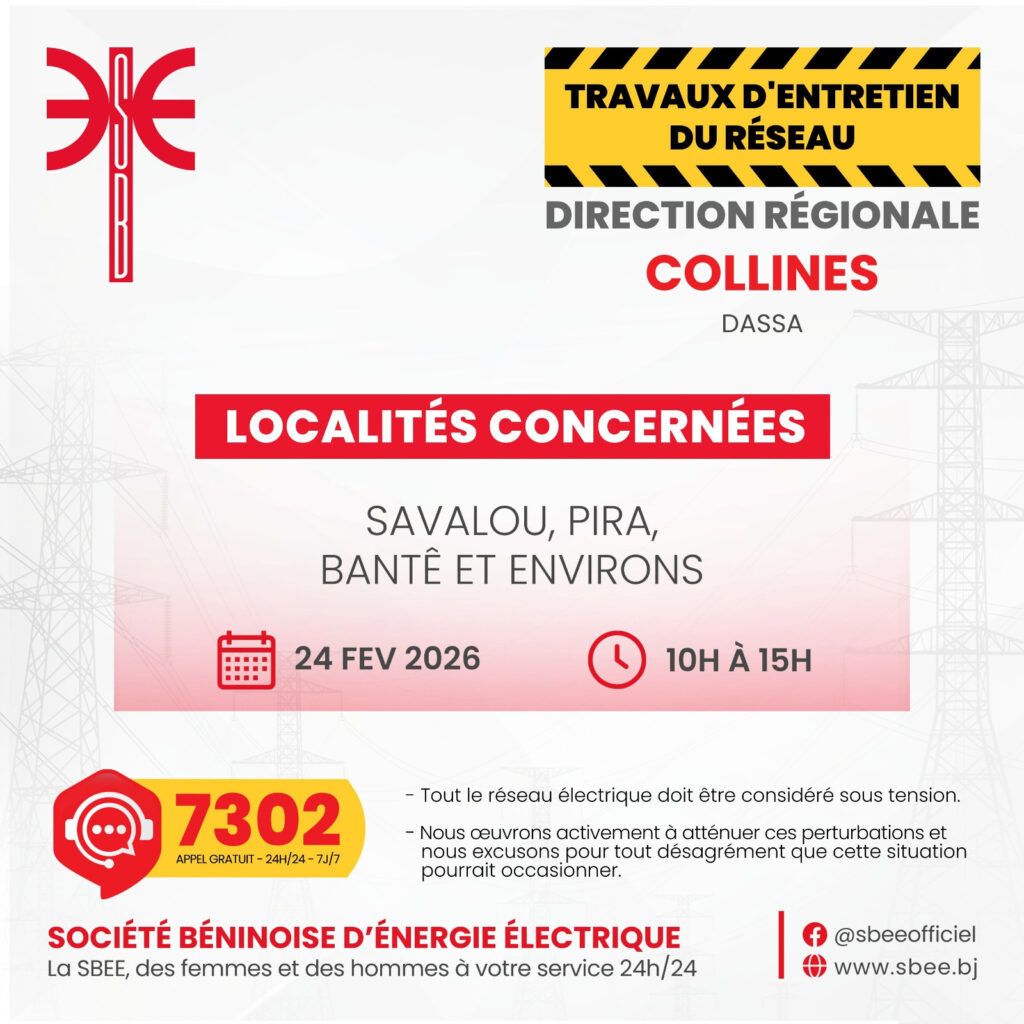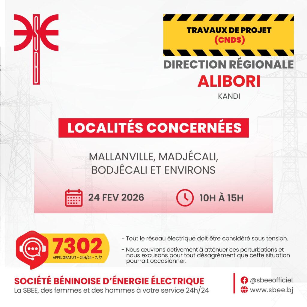 La Société Béninoise d’Énergie Électrique (SBEE) informe ses abonnés de perturbations de la fourniture d’électricité sur l’ensemble du territoire ce mardi 24 février 2026. Des travaux d’entretien du réseau et une opération liée au Projet CNDS entraîneront des coupures temporaires dans plusieurs localités, de 10 heures à 15 heures.