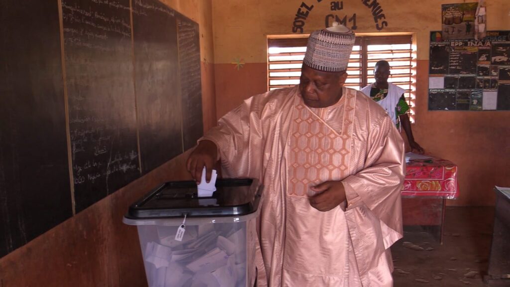 Ce dimanche 12 avril 2026 jour de vote Le Général Robert Gbian a accompli son devoir civique dans le calme et la simplicité, à l’image de tout citoyen ordinaire. Présente sur les lieux, une équipe de BL TV a surpris son arrivée à l’École primaire publique d’Ina, dans la commune de Bembèrèkè, alors qu’il descendait de son véhicule pour se rendre à son centre de vote.